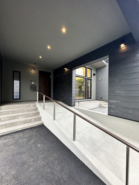 外壁は落ち着いたグレー色をまとめながら4種類の外壁を組み合わせました。ポーチにはスロープを設け、室内は全て段差のないフラットな設計。扉は全て引戸として、車いすでも安心して暮らせるように。どこにいても自然と光が届き、ゆるやかに時が流れる空間づくりを目指しました。