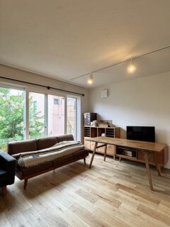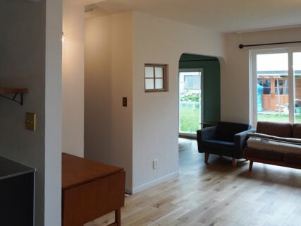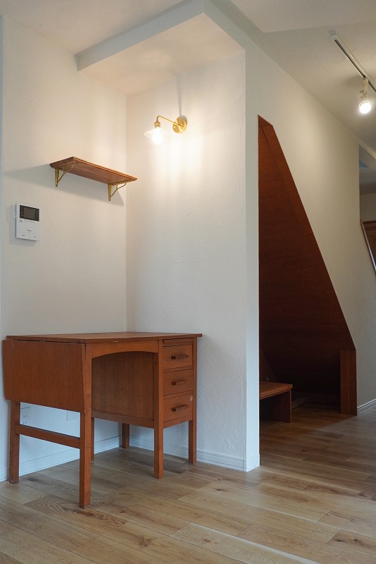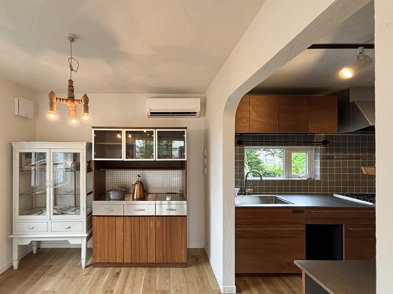 明るいオーク柄のフローリングを張り替え、塗り壁風のクロスで柔らかな表情に。アーチ開口や小窓などのディティールが室内をさりげなく演出します。窓から入る自然光とアンティーク家具が馴染み、落ち着いた大人の雰囲気に仕上がりました。