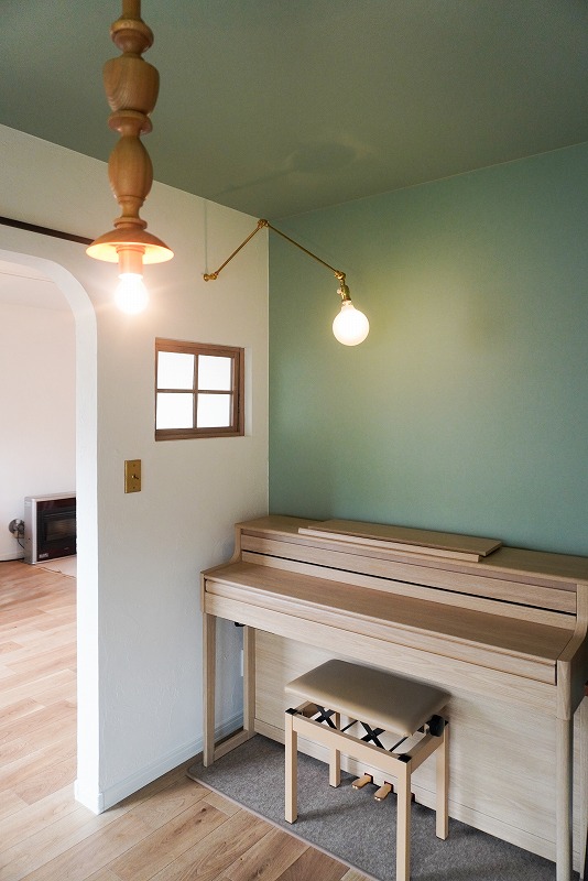 アーチの先にある小部屋は、天井から壁まで淡いミントグリーンで統一。色に包まれる心地良さと、照明が調和した特別な空間です。趣味の時間をゆったりと楽しめる、お気に入りのコーナーになりました。
