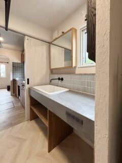キッチンはタイルと木を組み合わせ、温かみのあるデザインへ。造作洗面台はモルタルカウンターとボウルを組み合わせ、壁付けブラックの水栓や淡いタイルで奥様の世界観を再現しました。