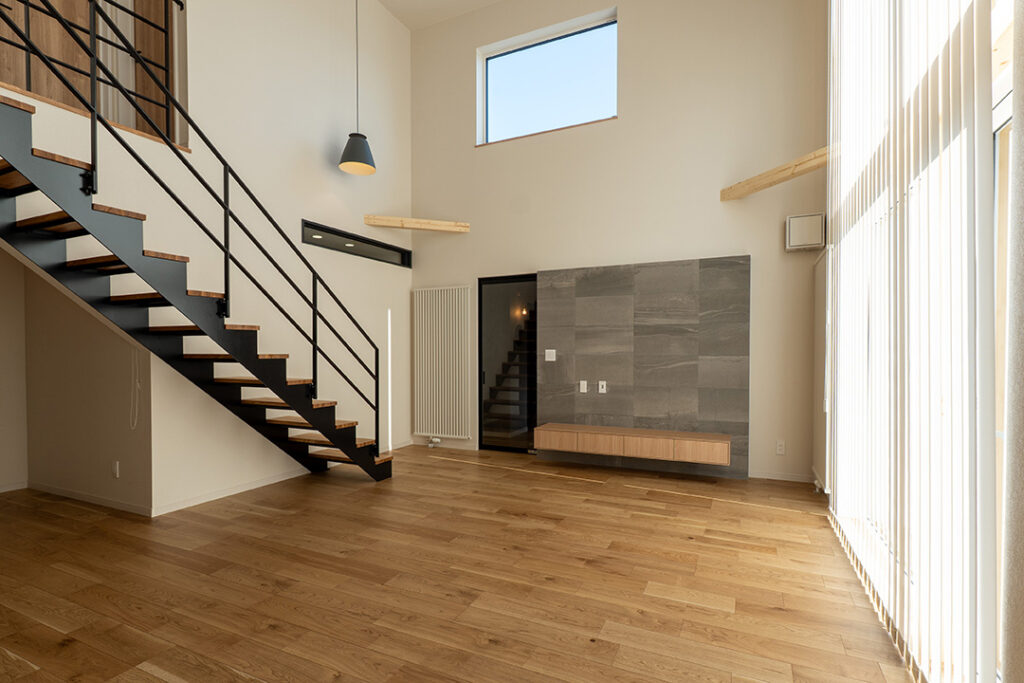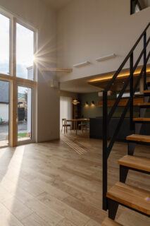 白を基調とした外観に木目を組み合わせ、シンプルでありながら温かみのある佇まいを目指した住まいです。大きな縦型の窓からは自然光がたっぷりと入り、季節や時間帯によって変わる光の表情が、暮らしに豊かさをもたらします。室内に入ると吹き抜けの開放感が広がり、黒のアイアン階段と木の踏板が空間にほどよいアクセントを添えています。