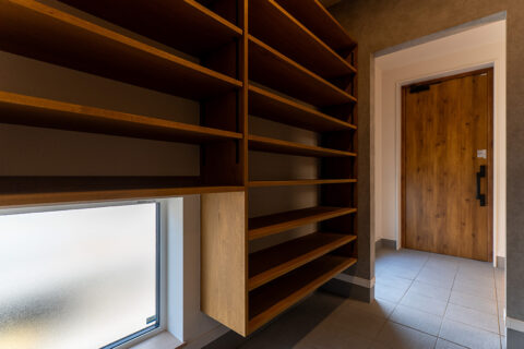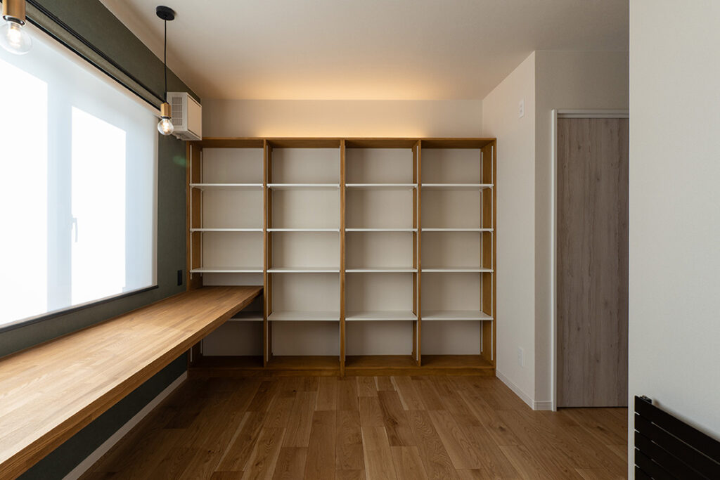 2階のワークスペースには造作棚と一体型デスクを設け、在宅ワークや趣味の時間を快適に過ごせるようにしました。