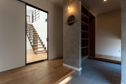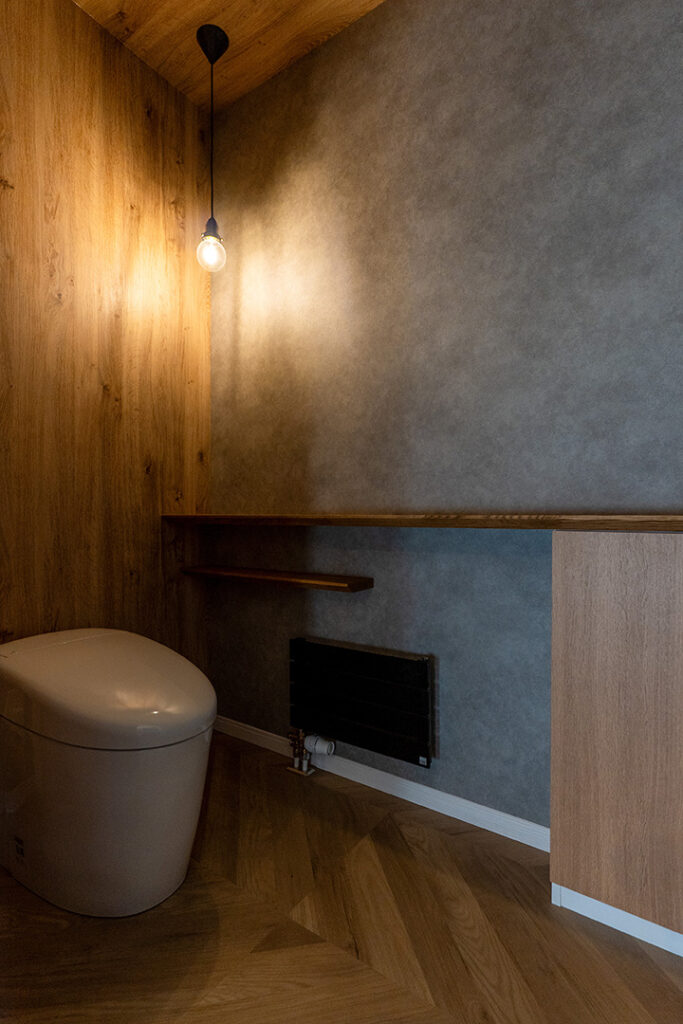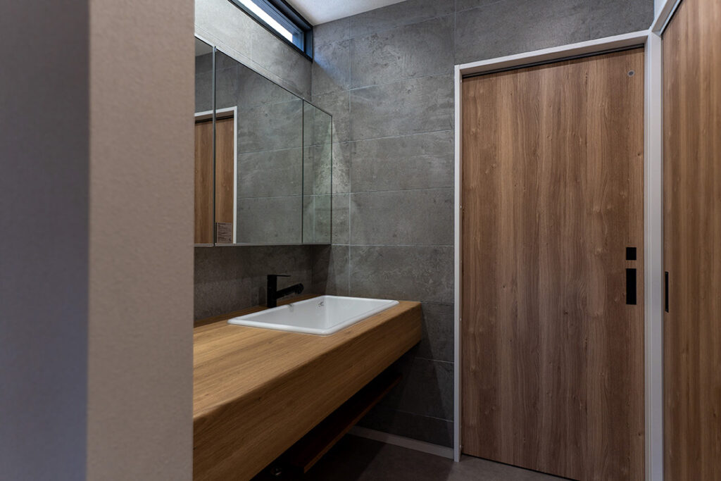 水まわりはグレーのタイルと木の洗面台を組み合わせ、ホテルライクな落ち着いた空間に。スライドドアを採用することで動線がスムーズになり、日々の暮らしを快適に支えます。