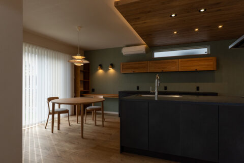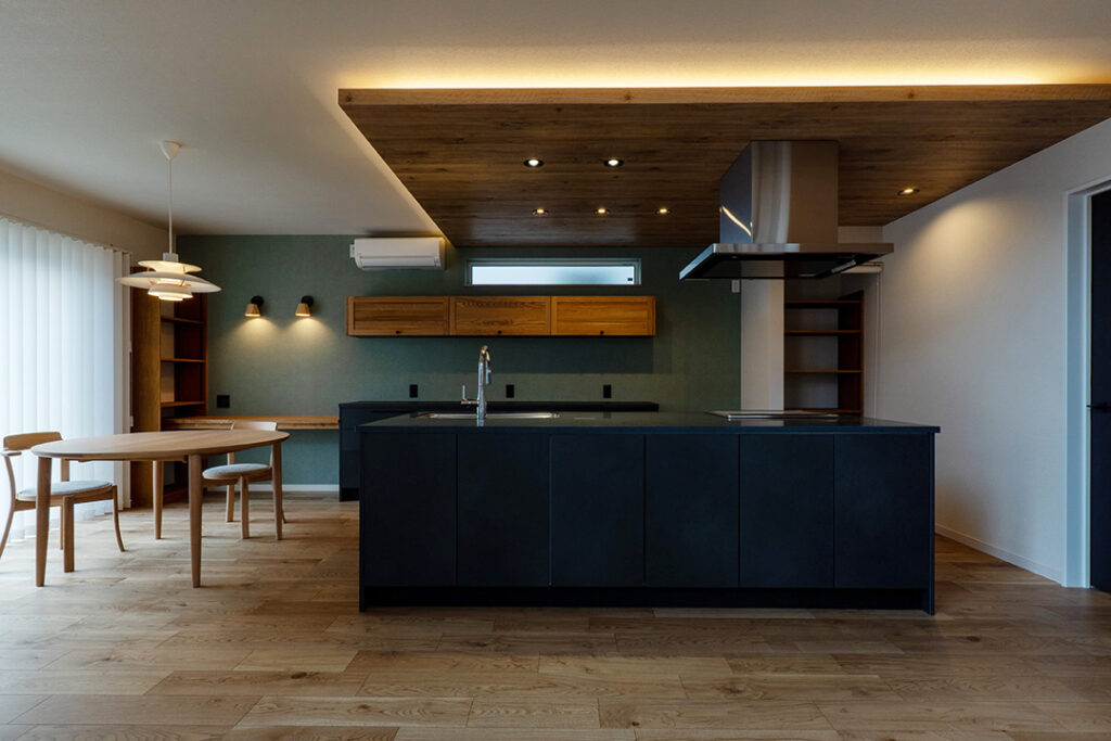 キッチンとダイニングは、落ち着いたダークトーンの面材と木天井が調和し、上質で温かみのある雰囲気に仕上げました。ダイニングテーブルは、旭川のカンディハウスまで足を運んで選んだ一品で、空間の中心として存在感を放ちます。その上にはルイスポールセンのPH5を採用し、柔らかな光がテーブルを包み込み、家族の時間をより豊かに演出します。