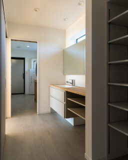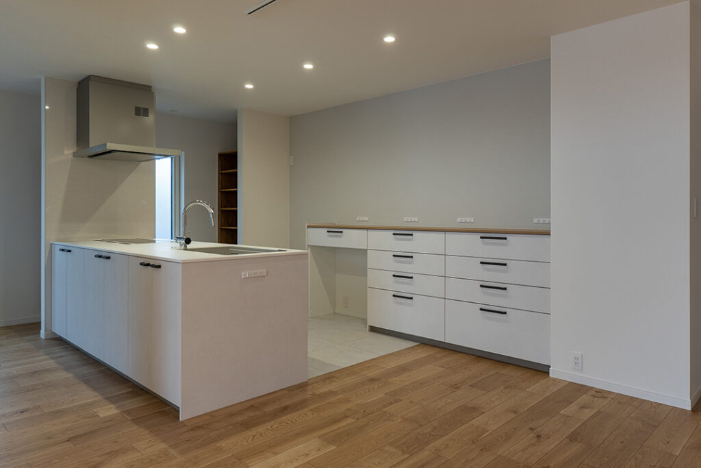 キッチンはリビング全体を見渡せる配置で、家事をしながら家族の様子を自然に感じられる安心設計。シンプルで手入れのしやすい素材を採用し、生活感を抑えた美しい空間を保てるよう工夫しています。