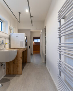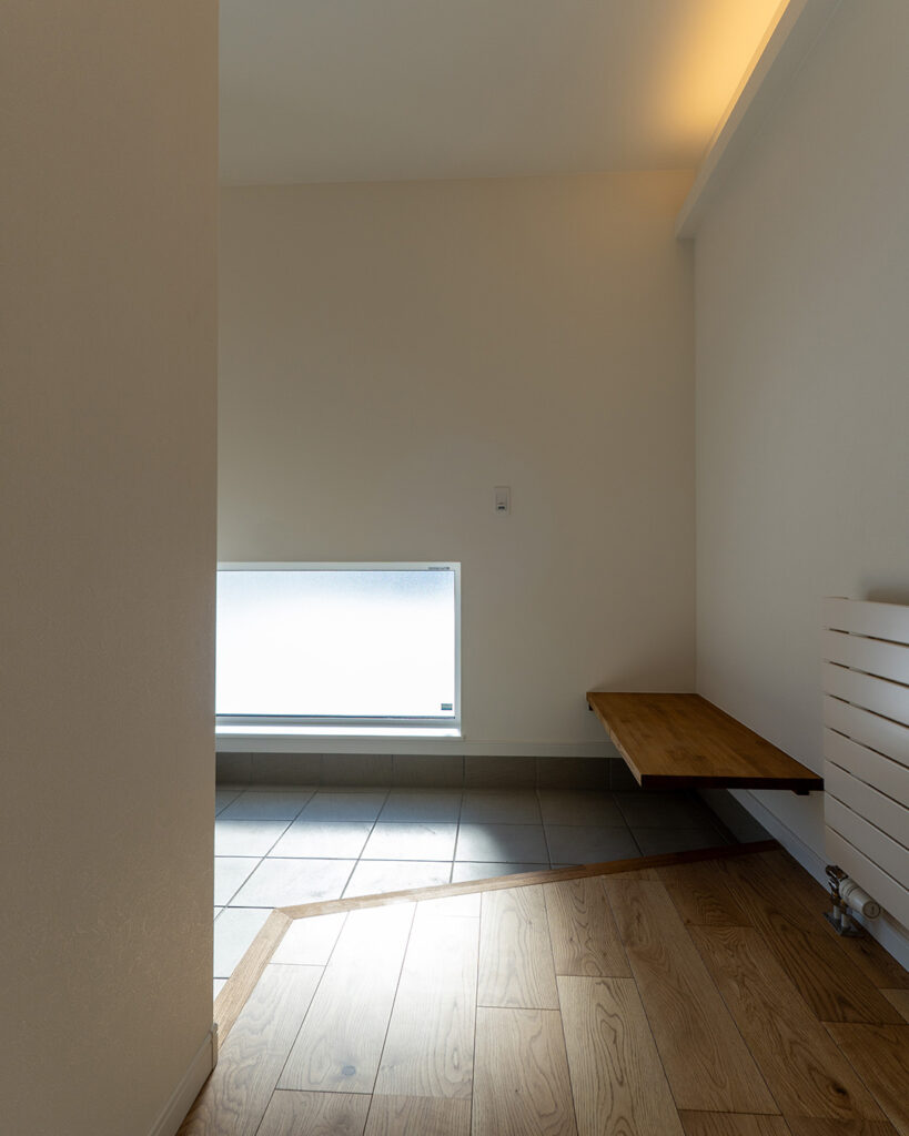 階段下には造作のベンチスペースを設け、収納・腰掛け・子どもの支度スペースなど多用途に使える“暮らしの便利ポイント”をプラス。限られた空間を無駄なく活かし、デザインと機能性を両立させました。