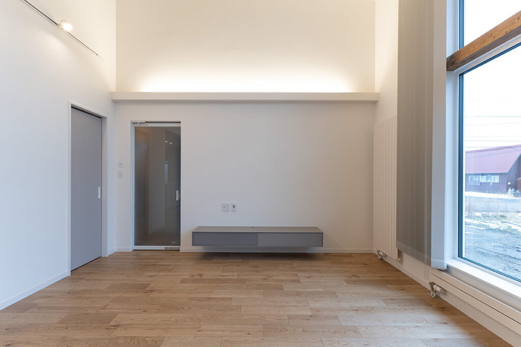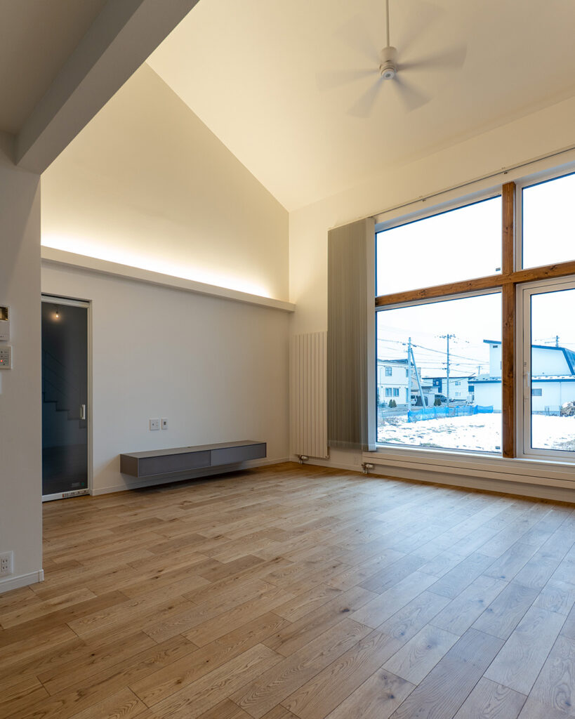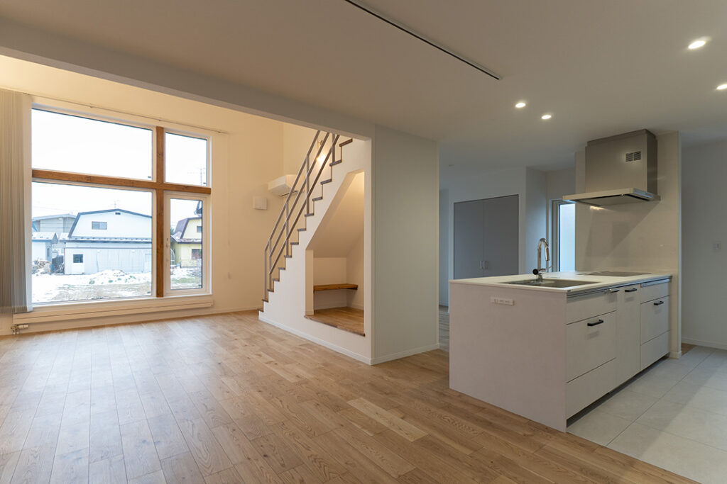 外の寒さを忘れるほど明るく暖かい室内環境と、素材の質感を大切にしたシンプルなデザイン。 「冬でも心地よく、家族が自然と集まる家」を目指してつくり上げた住まいです。