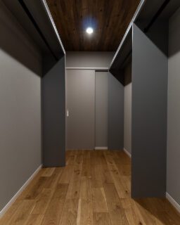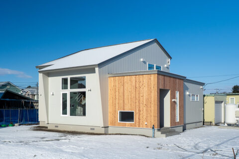 冬の暮らしを心地よくするために、断熱性能とデザイン性の両立を追求した住まいです。 外観は落ち着いたグレーをベースに、木目のアクセントを組み合わせ、シンプルでありながら温かみのある佇まいに仕上げました。大きな窓からは自然光がたっぷりと入り、雪景色が美しく映えるよう計画されています。